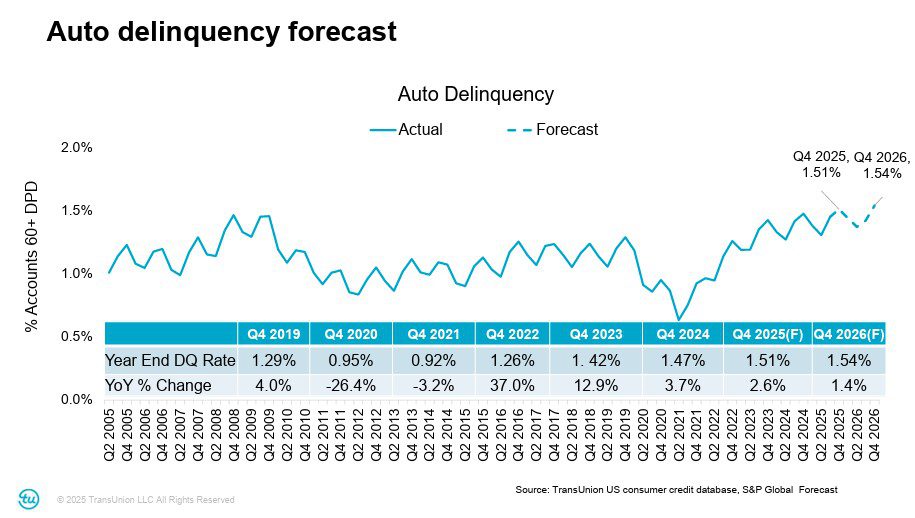 • Auto Loans: Accounts 60+ DPD are expected to reach 1.54% (+3 bps YoY), marking the fifth straight year of higher delinquencies—though each increase has become progressively smaller.