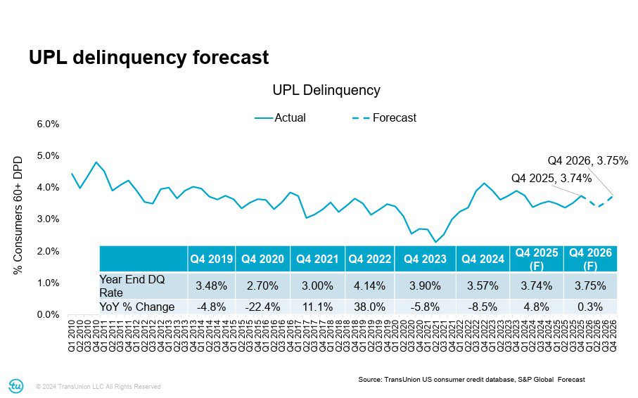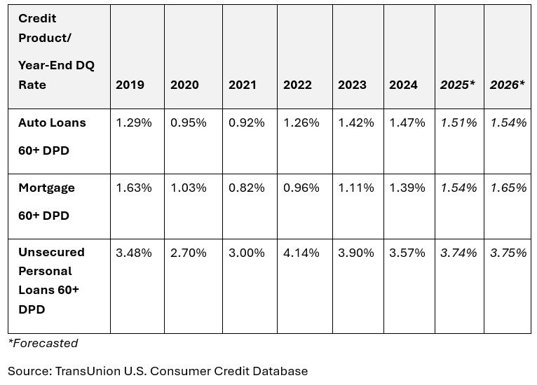 • Unsecured Personal Loans: Consumers 60+ DPD are forecast at 3.75% (+1 bps YoY), driven partly by macroeconomic pressures and increased non-prime originations.