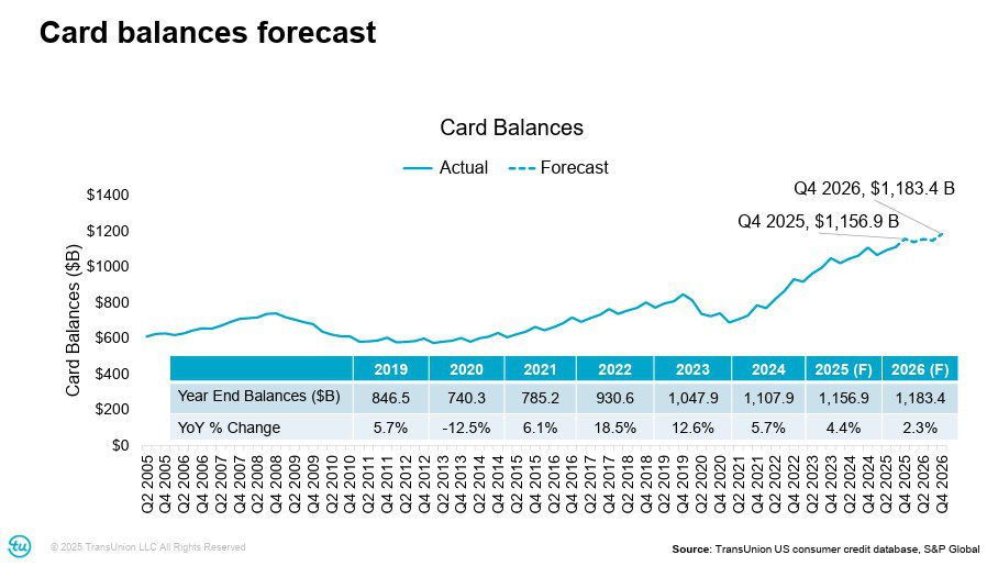 TransUnion (NYSE: TRU) today released its 2026 Consumer Credit Forecast, projecting credit card balances to grow 2.3% year over year (YoY)—the smallest annual increase since 2013, excluding 2020 when pandemic relief programs caused a decline. This moderation reflects consumers navigating persistent economic uncertainty as lenders maintain disciplined underwriting standards.