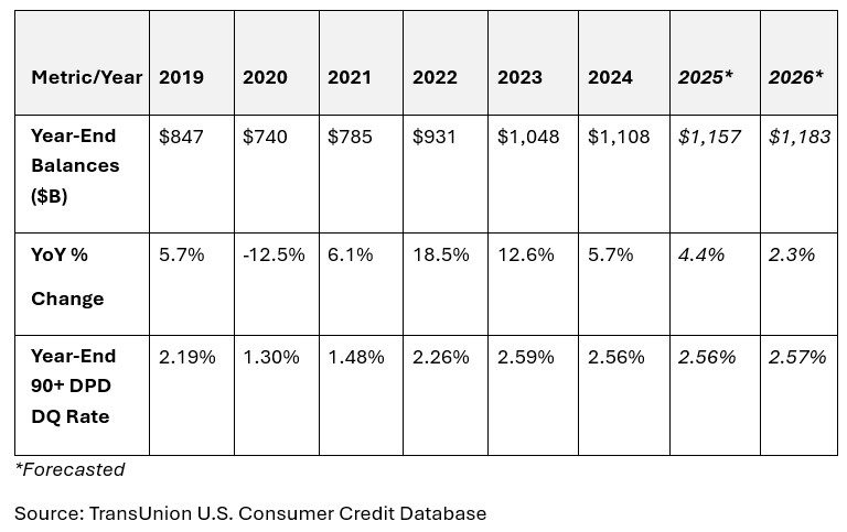 Credit card balances are expected to reach $1.18 trillion by the end of 2026, up from $1.16 trillion in 2025. This increase contrasts sharply with the double-digit growth of 2022 and 2023, but reflects the more modest pace of growth seen in more recent years. Lenders are cautiously expanding credit access for riskier consumer segments while prioritizing account management strategies to mitigate delinquency risk.